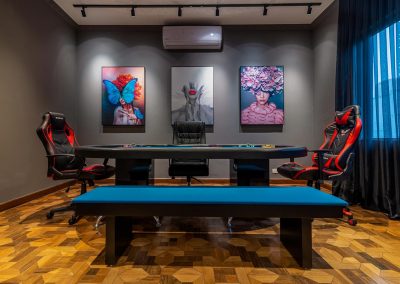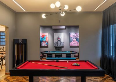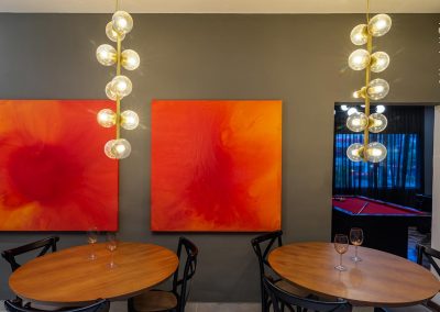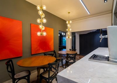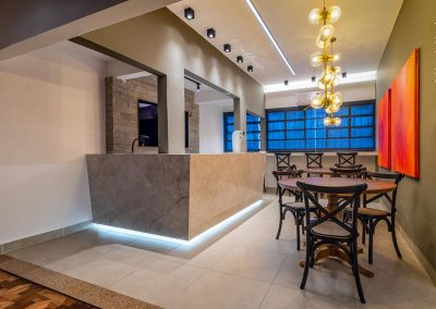 Sem forro de gesso, utilizamos perfis de LED e spots de sobrepor, trilhos com projetores cênicos e iluminamos as sancas que já existiam com fita de LED e pendentes decorativos, que deram a identidade para o espaço.